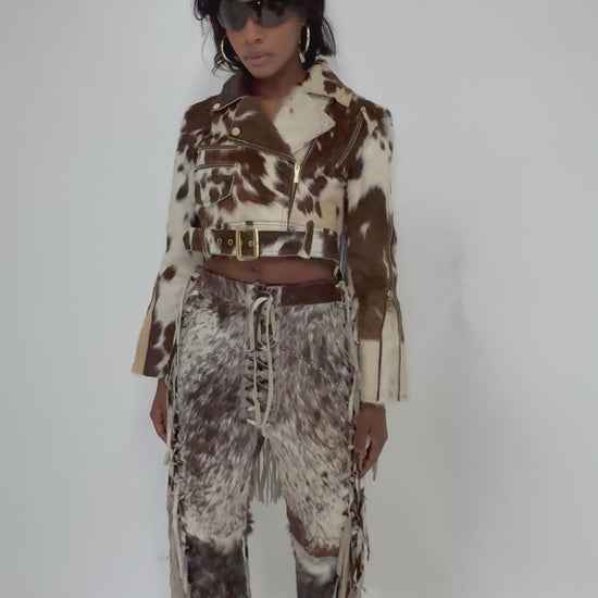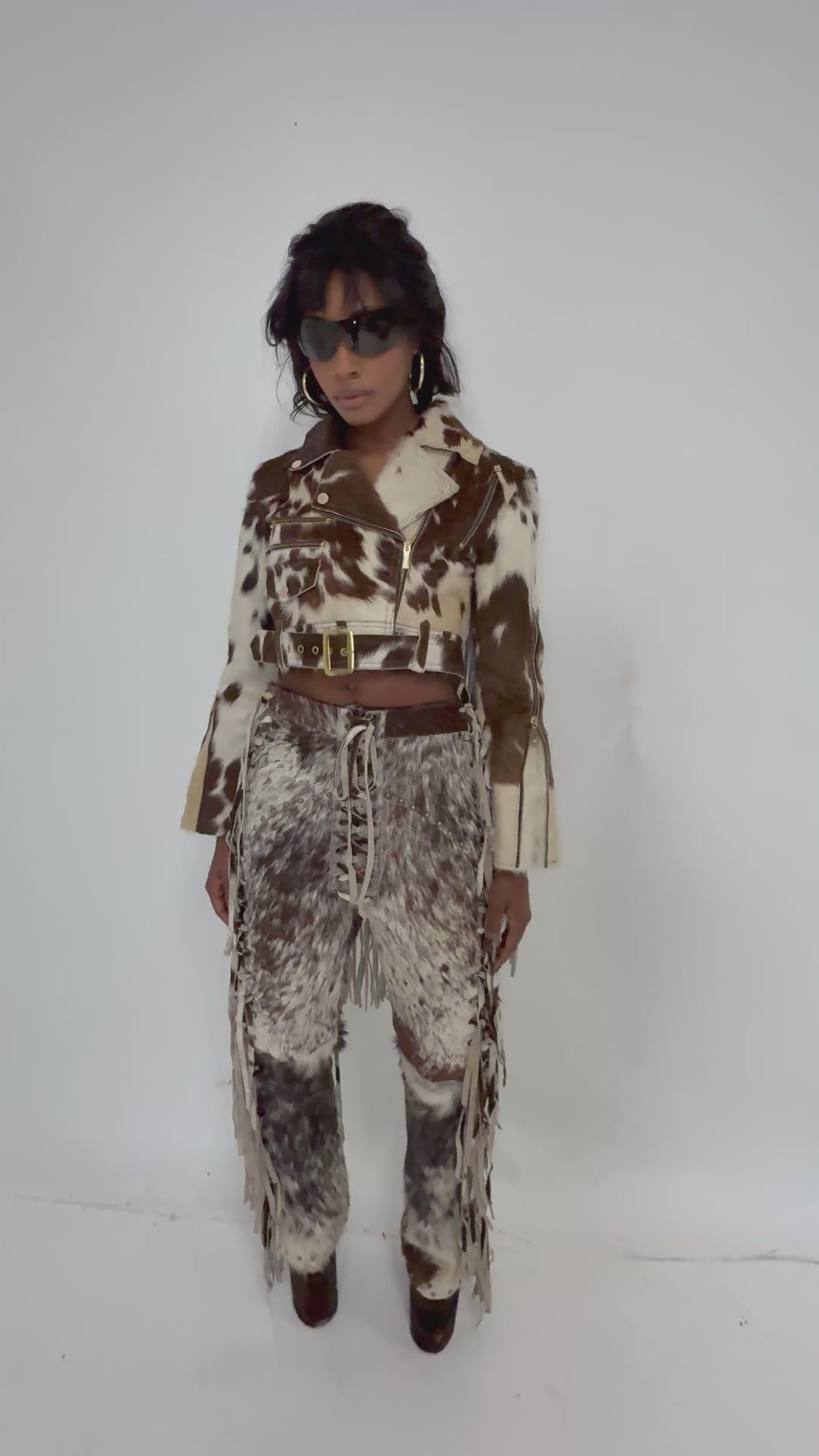 Our "Holy Kow" Fringe leather jacket features extended fringes on the back and sleeves, and shoulder padding. It is made from authentic cowhide and takes 2-3 weeks to produce.